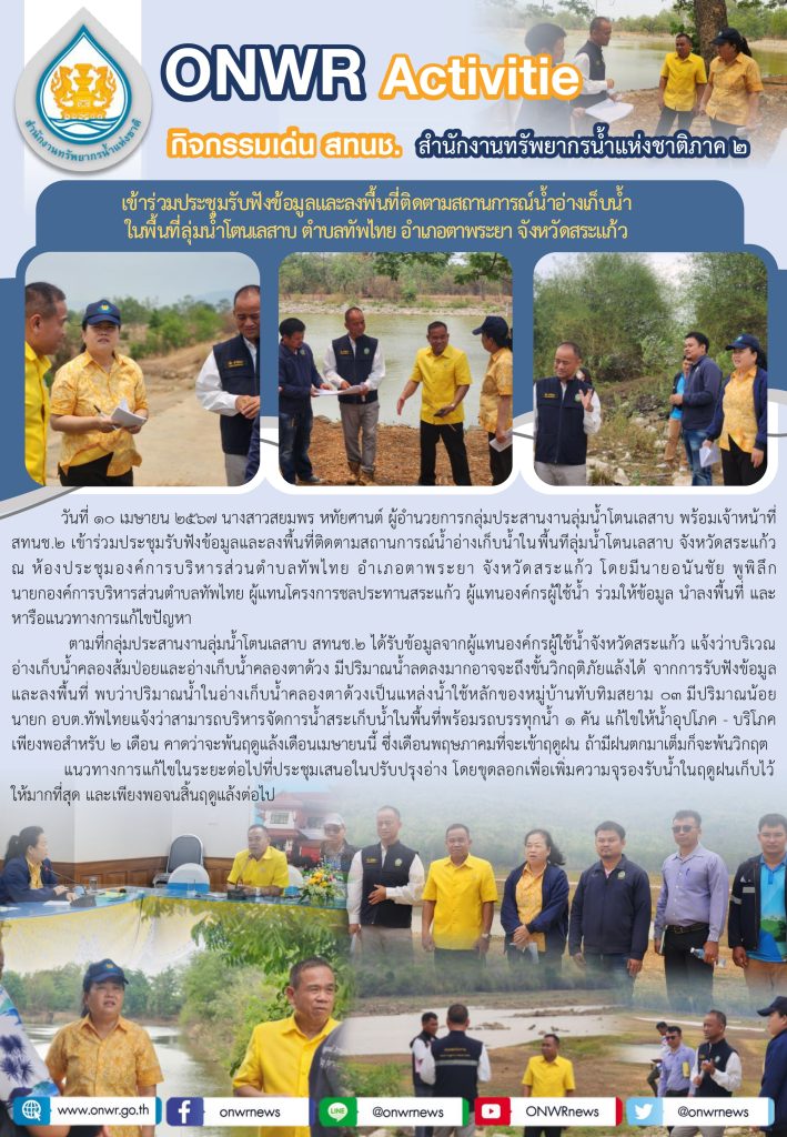สทนช.2 เข้าร่วมประชุมรับฟังข้อมูลและลงพื้นที่ติดตามสถานการณ์น้ำอ่างเก็บน้ำ ในพื้นที่ลุ่มน้ำโตนเลสาบ จ.สระแก้ว 18 เมษายน 2024 by ปวีณา ประกอบพันธ์