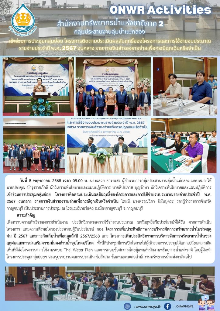 สทนช.2 เข้าร่วมการประชุมกลุ่มย่อยโครงการติดตามประเมินผลสัมฤทธิ์ของโครงการและการใช้จ่ายงบประมาณรายจ่ายประจำปี 2567 งบกลาง รายจ่ายเงินสำรองรายจ่ายเพื่อกรณีฉุกเฉินหรือจำเป็น 14 พฤษภาคม 2025 by ปวีณา ประกอบพันธ์