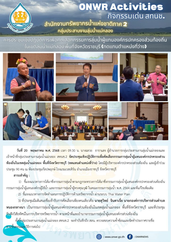 สทนช.2 เข้าร่วมการประชุมเชิงปฏิบัติการเพื่อคัดเลือกกรรมการลุ่มน้ำผู้แทนองค์กรปกครองส่วนท้องถิ่นในเขตลุ่มน้ำแม่กลอง พื้นที่จังหวัดราชบุรี (ทดแทนตำแหน่งที่ว่าง) 21 พฤษภาคม 2025 by ปวีณา ประกอบพันธ์