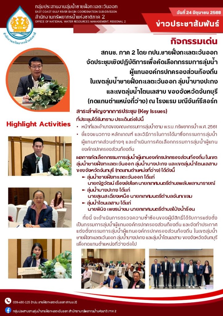 สทนช.2 จัดประชุมเชิงปฏิบัติการเพื่อคัดเลือกกรรมการลุ่มน้ำผู้แทน อปท. ในเขตลุ่มน้ำชายฝั่งทะเลตะวันออก ลุ่มน้ำบางปะกง และเขตลุ่มน้ำโตนเลสาบ (ทดแทนตำแหน่งที่ว่าง) จ.จันทบุรี 27 มิถุนายน 2025 by ปวีณา ประกอบพันธ์