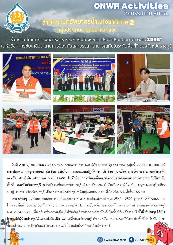 สทนช.2 เข้าร่วมงานสมัชชาการจัดการสาธารณภัยระดับจังหวัด ประจำปีงบประมาณ พ.ศ.2568 ในหัวข้อ”ขับเคลื่อนแผนการป้องกันและบรรเทาสาธารณภัยในระดับพื้นที่”ของจังหวัดราชบุรี 3 กรกฎาคม 2025 by ปวีณา ประกอบพันธ์