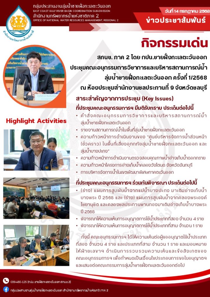 สทนช.2 โดย กปน. ชายฝั่งทะเลตะวันออก ประชุมคณะอนุกรรมการวิชาการและบริหารสถานการณ์น้ำ ลุ่มน้ำชายฝั่งทะเลตะวันออก ครั้งที่ 1/2568 16 กรกฎาคม 2025 by ปวีณา ประกอบพันธ์